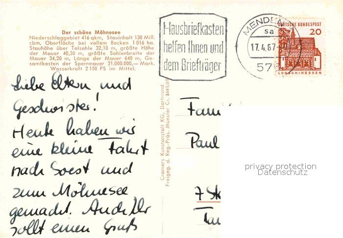 72797758 alte Postkarte Moehnesee Fliegeraufnahme postalisch gelaufen Erhaltung siehe scans [FriedD77] KatCode: 11110005974032