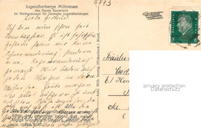 73703129 alte Postkarte Moehnesee Jugendherberge Moehnesee Aussenansicht postalisch gelaufen Erhaltung siehe scans [LiesaD40] KatCode: 11110005974032