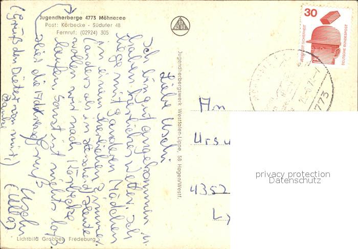 72526457 alte Postkarte Moehnesee Jugendherberge postalisch gelaufen Erhaltung siehe scans KatCode: 11110005974032