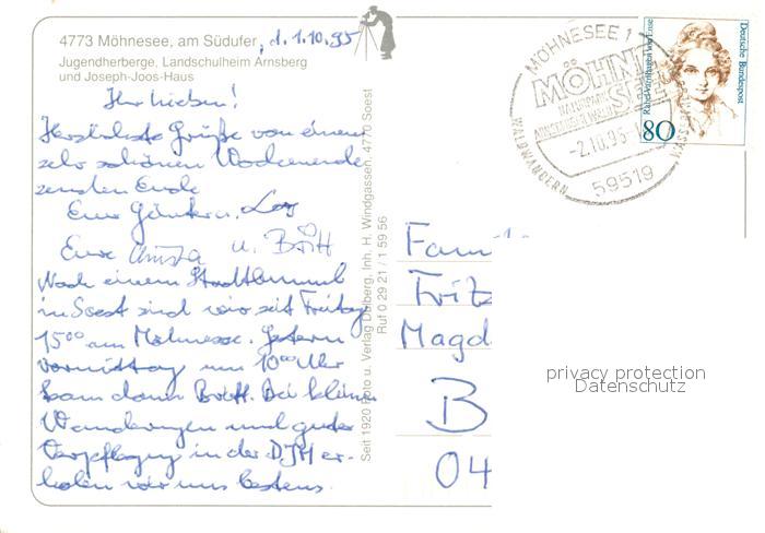 73320983 alte Postkarte Moehnesee Landschulheim Arnsberg und Joseph Hoos Haus Fliegeraufnahme postalisch gelaufen Erhaltung siehe scans [WerneD78] KatCode: 11110005974032