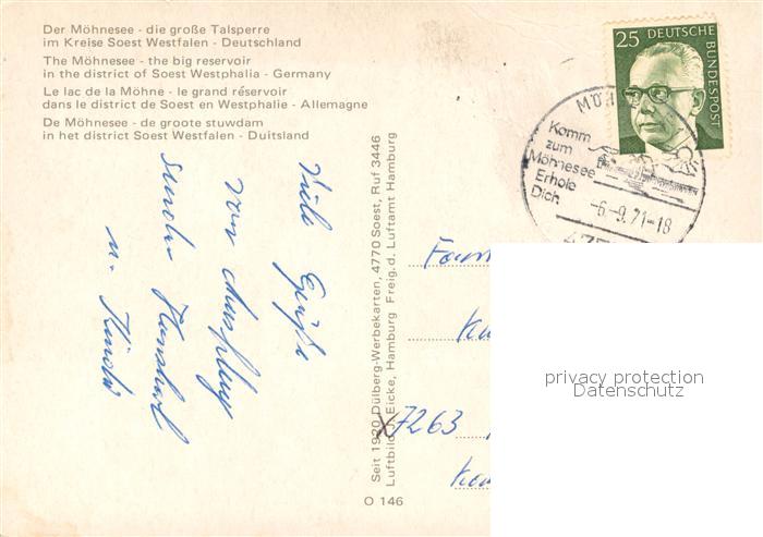 73722034 alte Postkarte Moehnesee Talsperre postalisch gelaufen Fliegeraufnahme Erhaltung siehe scans [FriedD77] KatCode: 11110005974032