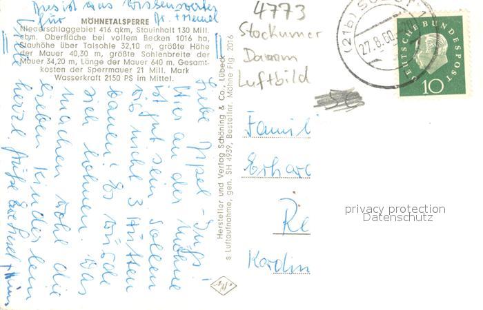 73694084 alte Postkarte Moehnetalsperre Stockumer Damm postalisch gelaufen Fliegeraufnahme Erhaltung siehe scans [WerneD78] KatCode: 11110005958044
