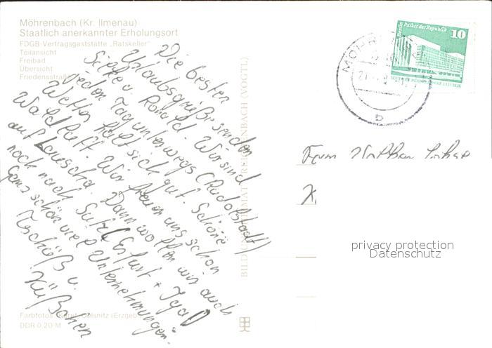 72373144 alte Postkarte Moehrenbach FDGB Vertragsgastaette Ratskeller Freibad Teilansicht Friedensstrasse postalisch gelaufen Erhaltung siehe scans KatCode: 11110016070035
