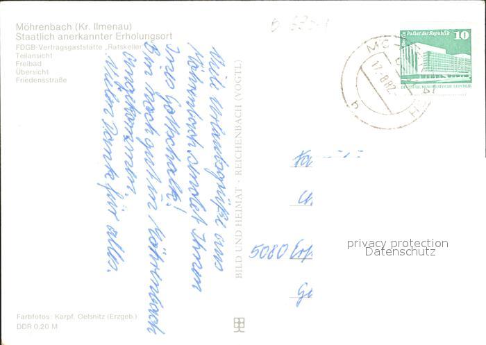 72373140 alte Postkarte Moehrenbach FDGB Vertragsgaststaette Ratskeller Teilansicht Freibad Friedensstrasse postalisch gelaufen Erhaltung siehe scans KatCode: 11110016070035