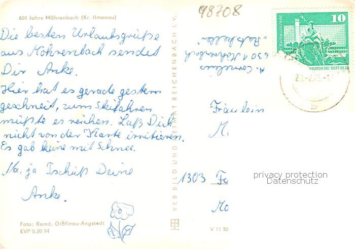73865245 alte Postkarte Moehrenbach Panorama Ortsmotiv mit Kirche Schwanenteich Wappen postalisch gelaufen Erhaltung siehe scans [FriedD77] KatCode: 11110016070035