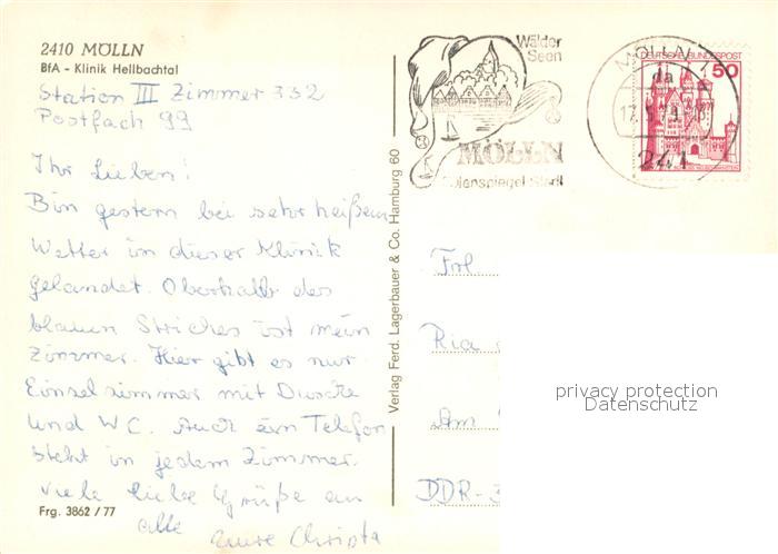 73687789 alte Postkarte Moelln Lauenburg BfA Klinik Hellbachtal Fliegeraufnahme postalisch gelaufen Erhaltung siehe scans [WerneD78] KatCode: 11110001053090