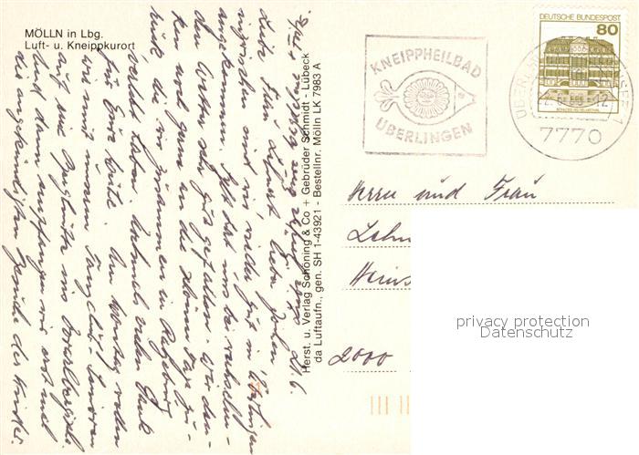 72954393 alte Postkarte Moelln Lauenburg Eulenspiegelstadt Kneipp Luftkurort Naturpark Lauenburgische Seen Fliegeraufnahme postalisch gelaufen Erhaltung siehe scans [FriedD77] KatCode: 11110001053090