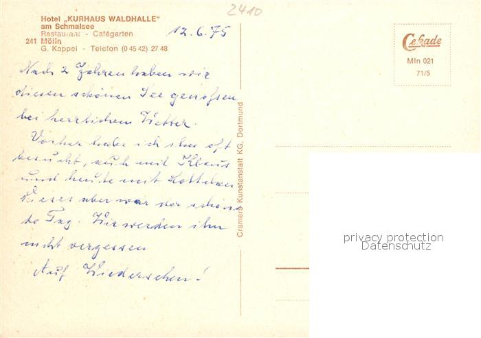 73163659 alte Postkarte Moelln Lauenburg Hotel Kurhaus Waldhalle am Schmalsee Cafegarten postalisch gelaufen Erhaltung siehe scans [FriedD77] KatCode: 11110001053090