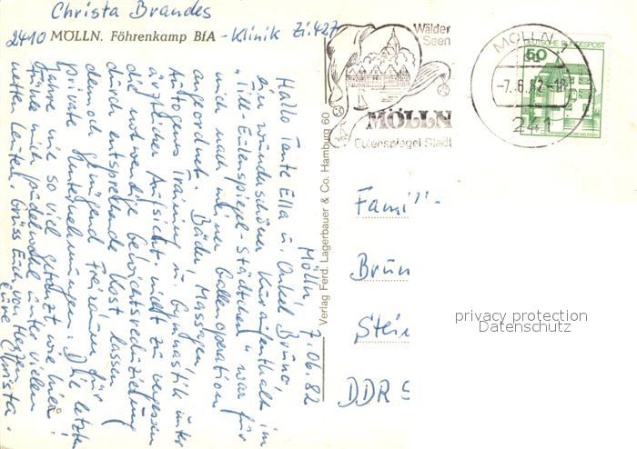 73680781 alte Postkarte Moelln Lauenburg Klinik Foehrenkamp der BfA postalisch gelaufen Erhaltung siehe scans [LiesaD40] KatCode: 11110001053090