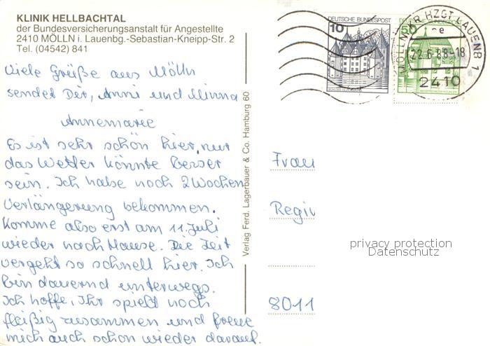 73768620 alte Postkarte Moelln Lauenburg Klinik Hellbachtal der BfA postalisch gelaufen Erhaltung siehe scans [WerneD78] KatCode: 11110001053090