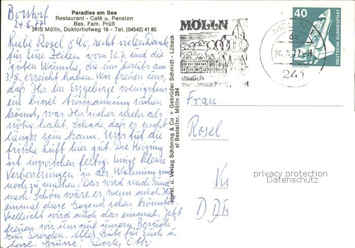 72032828 alte Postkarte Moelln Lauenburg Paradies am See Restaurant Cafe Pension postalisch gelaufen Erhaltung siehe scans KatCode: 11110001053090