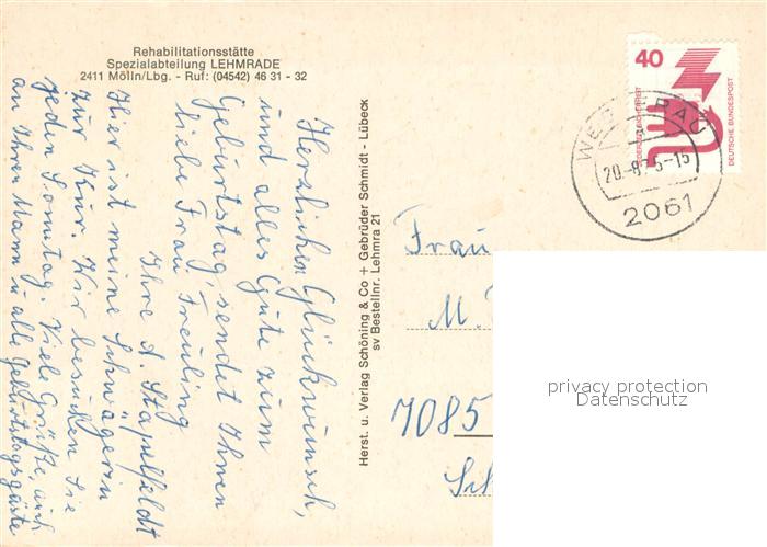 73653488 alte Postkarte Moelln Lauenburg Rehabilitationsstaette Spezialabteilung Lehmrade Seepartie Aufenthaltsraum postalisch gelaufen Erhaltung siehe scans [WerneD78] KatCode: 11110001053090