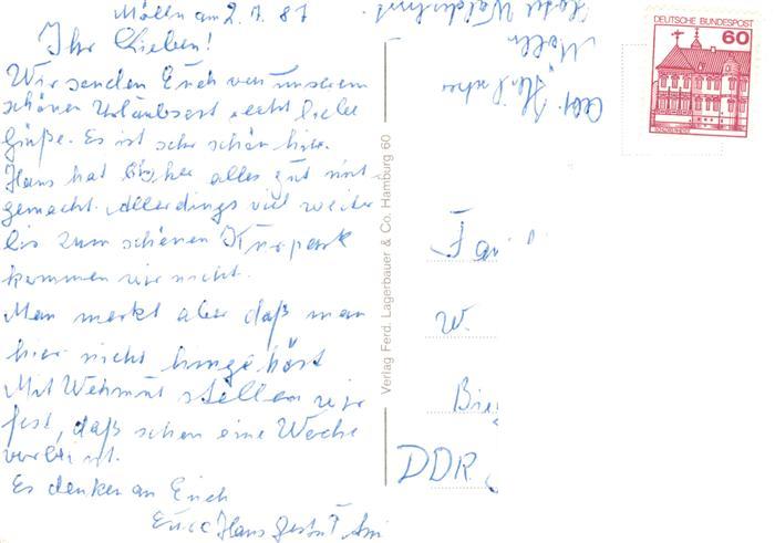 73945084 alte Postkarte Moelln Lauenburg Stadtpanorama Klinik Brunnen Partie am See Augustinum Markt Rathaus Wasserturm postalisch gelaufen Erhaltung siehe scans [FriedD77] KatCode: 11110001053090
