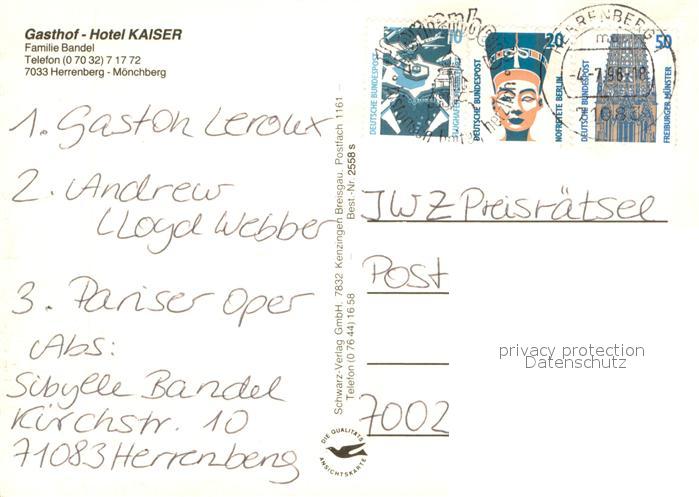 73652694 alte Postkarte Moenchberg Herrenberg Gasthof Hotel Kaiser Restaurant Stadtpanorama postalisch gelaufen Erhaltung siehe scans [FriedD77] KatCode: 11110008115021