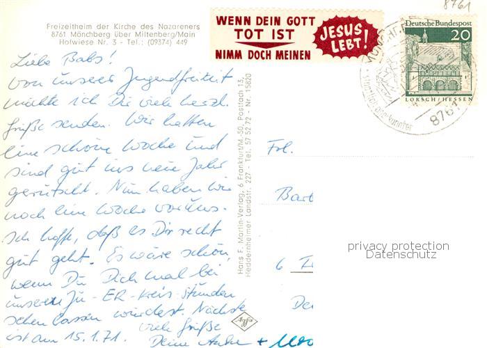 73852635 alte Postkarte Moenchberg Spessart Freizeitheim der Kirche des Nazareners Treppenaufgang Aufenthaltsraum Zimmer postalisch gelaufen Erhaltung siehe scans [WerneD78] KatCode: 11110009676141