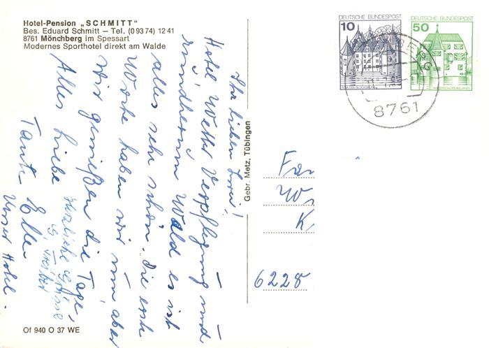 73883206 alte Postkarte Moenchberg Spessart Hotel Pension Schmitt Panorama Gaststube Terrasse Tennisplatz Hallenbad postalisch gelaufen Erhaltung siehe scans [FriedD77] KatCode: 11110009676141