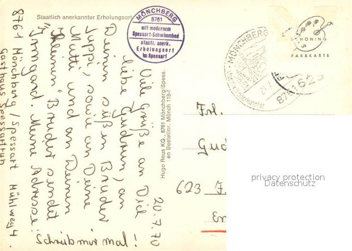 73168126 alte Postkarte Moenchberg Spessart Kirche Altarraum Denkmal Schwimmbad Blumengarten postalisch gelaufen Erhaltung siehe scans [KathaD81] KatCode: 11110009676141