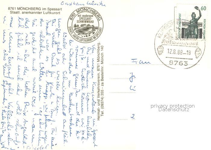 73671843 alte Postkarte Moenchberg Spessart Panorama Minigolfplatz Fachwerkhaeuser Wassertretanlagen postalisch gelaufen Erhaltung siehe scans [WerneD78] KatCode: 11110009676141