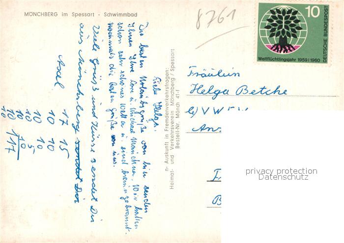 73613299 alte Postkarte Moenchberg Spessart Schwimmbad postalisch gelaufen Erhaltung siehe scans [KathaD81] KatCode: 11110009676141