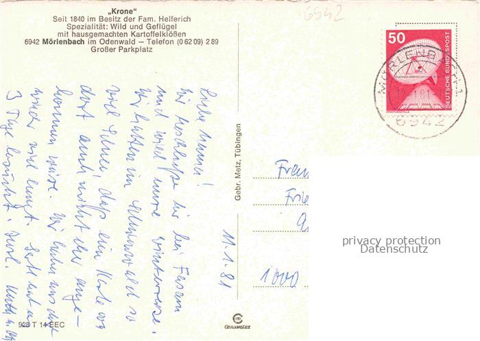 74048105 alte Postkarte Moerlenbach Hotel Restaurant Krone Gastraum Tuerschild postalisch gelaufen Erhaltung siehe scans [FriedD77] KatCode: 11110006431017