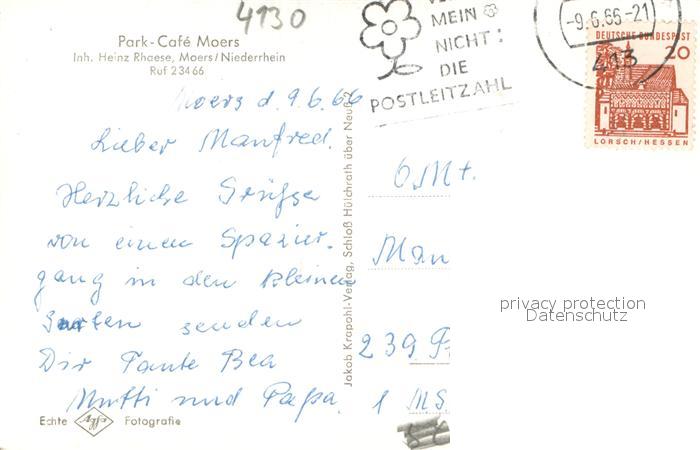 73693277 alte Postkarte Moers Moers Park Cafe im Schlosspark Statue Gondelteich Wasserspiele postalisch gelaufen Erhaltung siehe scans [WerneD78] KatCode: 11110005170024