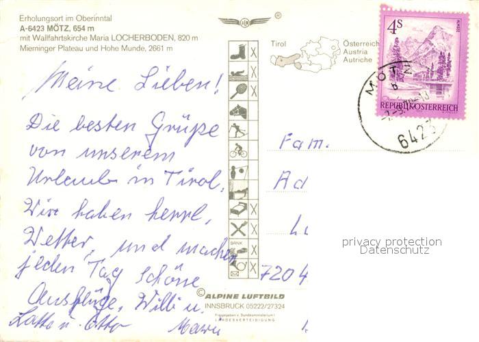 73245829 alte Postkarte Moetz Erholungsort Oberinntal Wallfahrtskirche Maria Locherboden Mieminger Plateau Hohe Munde Fliegeraufnahme postalisch gelaufen Erhaltung siehe scans [FriedD77] KatCode: 11390334070211