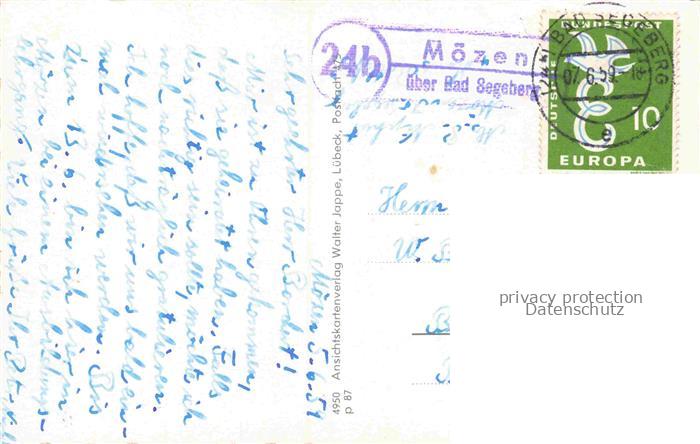 74119838 alte Postkarte Moezen am See Segeberg Schleswig-Holstein Gemischtwaren Post Partie am See Bruecke Dorfstrasse postalisch gelaufen Erhaltung siehe scans [FriedD77] KatCode: 11110001060057