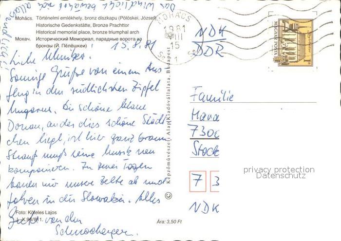 old postcard Mohacs Bronze Prachttor Gedenkstaette postalisch gelaufen Erhaltung siehe scans