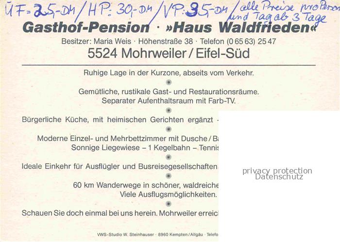 74055169 Mohrweiler Malberg Eifelkreis Bitburg-Pruem Rheinland-Pfalz Gasthof Waldfrieden Kegelbahn Zimmer Gastraum postalisch nicht gelaufen Werbekarte (keine Postkarte) Erhaltung siehe scans [WerneD78] KatCode: 11110007232075