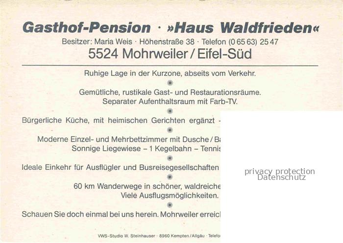 74055168 Mohrweiler Malberg Eifelkreis Bitburg-Pruem Rheinland-Pfalz Gasthof Waldfrieden Kegelbahn Zimmer Gastraum postalisch nicht gelaufen Werbekarte (keine Postkarte) Erhaltung siehe scans [WerneD78] KatCode: 11110007232075