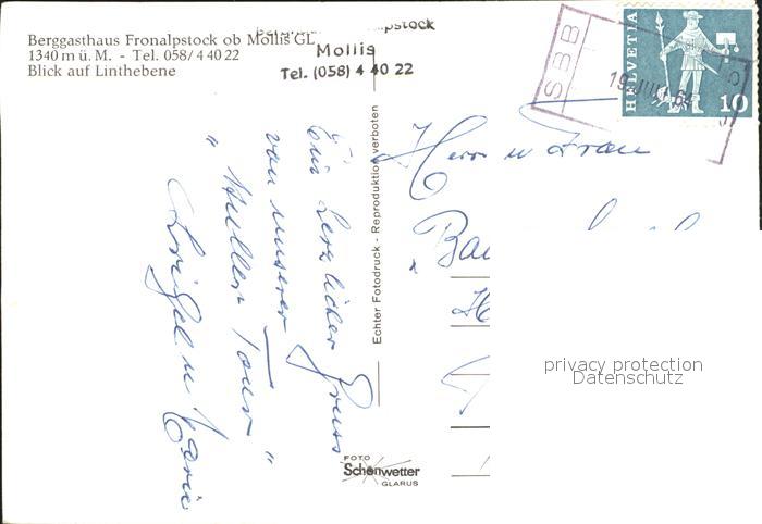 11631730 alte Postkarte Mollis Berggasthof Fronalpstock Blick auf Linthebene postalisch gelaufen Erhaltung siehe scans KatCode: 11470090300896