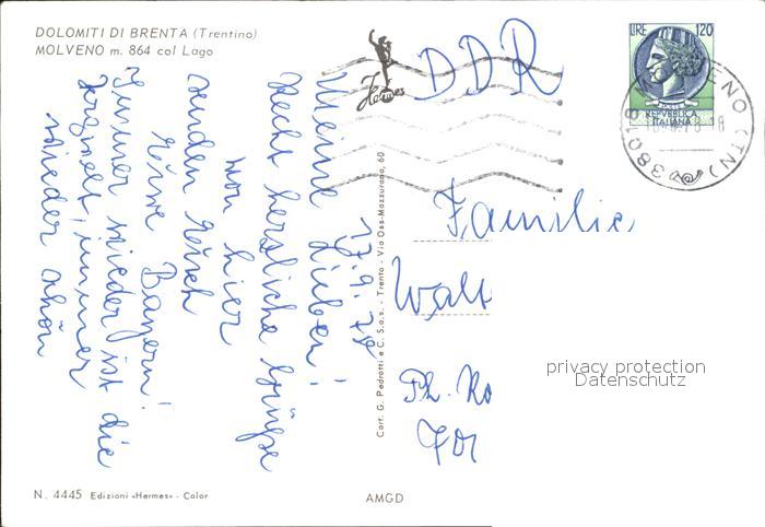 alte Postkarte Molveno Panorama mit See postalisch gelaufen Erhaltung siehe scans