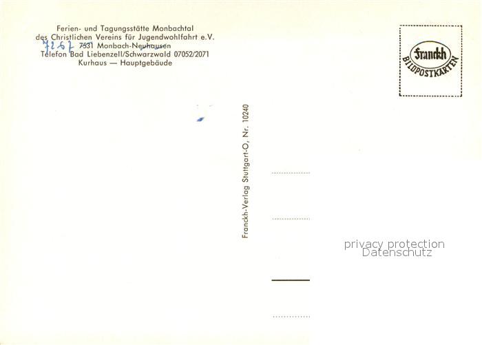 73649922 Monbach-Neuhausen Enzkreis Ferien- und Tagungsstaette Monbachtal Christlicher Verein fuer Jugendwohlffahrt e.V. postalisch nicht gelaufen Erhaltung siehe scans [FriedD77] KatCode: 11110008236044