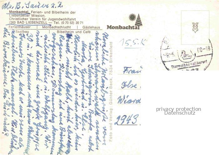 74153590 alte Postkarte Monbachtal Bad Liebenzell CALW BW Ferien- und Bibelheim der Liebenzeller Mission Ferienhaeuser Monbachschlucht Gaestehaus Saalbau Bibelheim Café postalisch gelaufen Erhaltung siehe scans [FriedD77] KatCode: 11110008235008
