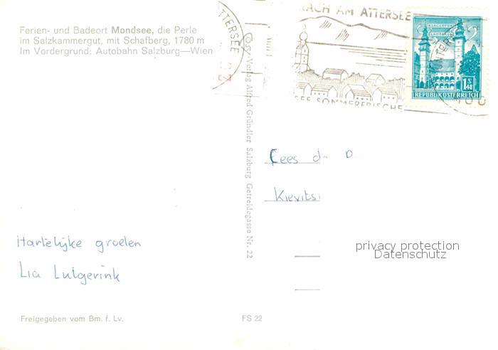 72823301 alte Postkarte Mondsee Salzkammergut Autobahn Salzburg Wien See Alpenpanorama Fliegeraufnahme postalisch gelaufen Erhaltung siehe scans [FriedD77] KatCode: 11390315041715