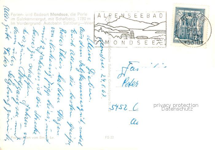 73340141 alte Postkarte Mondsee Salzkammergut Fliegeraufnahme mit Schafberg und Autobahn Salzburg-Wien postalisch gelaufen Erhaltung siehe scans [LiesaD40] KatCode: 11390315041715