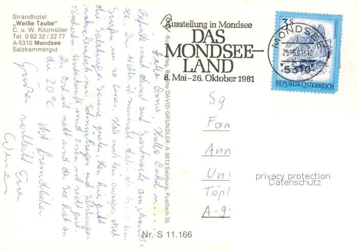 73588157 alte Postkarte Mondsee Salzkammergut Hotel Weisse Taube Liegewiese Badesteg Fliegeraufnahme postalisch gelaufen Erhaltung siehe scans [FriedD77] KatCode: 11390315041715