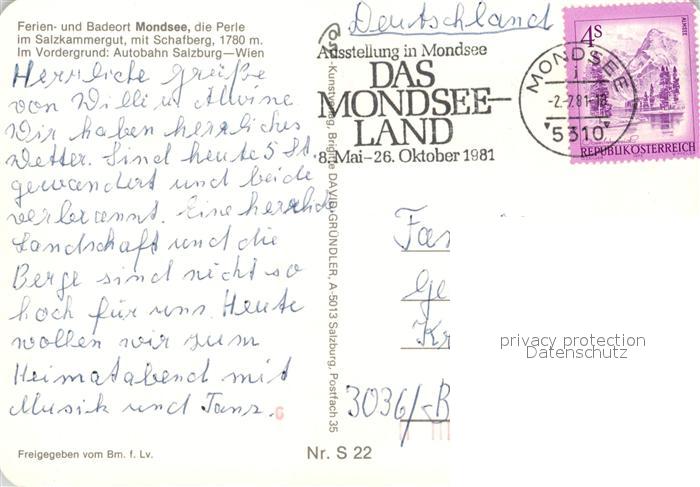 73060045 alte Postkarte Mondsee Salzkammergut mit Schafberg Fliegeraufnahme postalisch gelaufen Erhaltung siehe scans [FriedD77] KatCode: 11390315041715