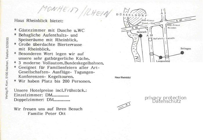 74110235 Monheim Rhein Hotel Restaurant Haus Rheinblick Speisesaal Gastraeume Kegelbahn postalisch nicht gelaufen Werbekarte (keine Postkarte) Erhaltung siehe scans [WerneD78] KatCode: 11110005158026