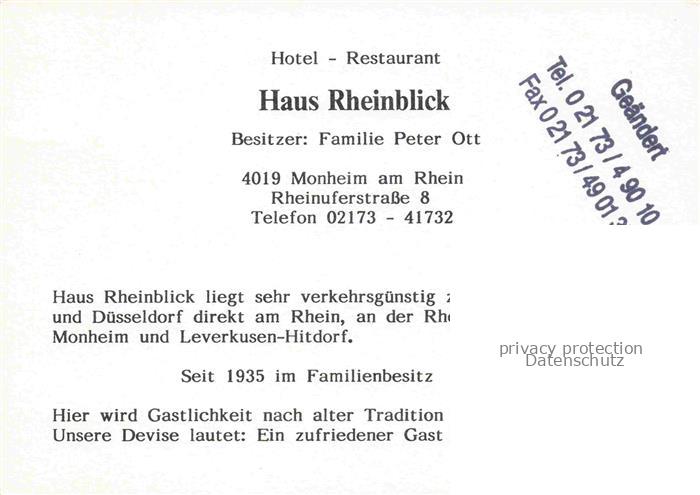 74110234 Monheim Rhein Hotel Restaurant Haus Rheinblick Speisesaal postalisch nicht gelaufen Werbekarte (keine Postkarte) Erhaltung siehe scans [WerneD78] Werbekarte (keine Postkarte) Wern Katcode 11110005158026