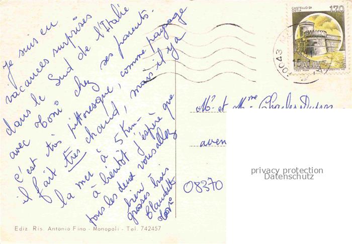74035208 old postcard Monopoli Puglia IT Castello Svevo di Federico II Piazza Vittorio Emanuele Palazzo Palmieri Istituto d’Are postalisch gelaufen Erhaltung siehe scans [FriedD77] KatCode: 11240