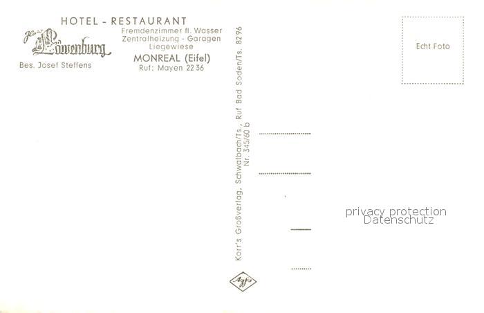 73333300 Monreal Eifel Hotel Restaurant Loewenburg Fachwerkhaus Burgruine postalisch nicht gelaufen Erhaltung siehe scans [FriedD77] KatCode: 11110007137074