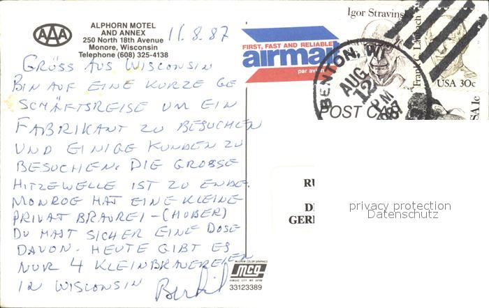 71970543 old postcard Monroe Wisconsin Alphorn Motel Annex postalisch gelaufen KatCode: 14140520000000