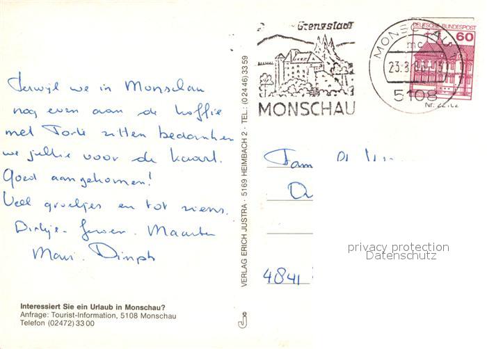 72936487 alte Postkarte Monschau Altstadt Platz Fachwerkhaeuser Rotes Haus Burgruine postalisch gelaufen Erhaltung siehe scans [FriedD77] KatCode: 11110005354020