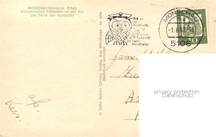 73141860 alte Postkarte Monschau Blick auf die Altstadt postalisch gelaufen Erhaltung siehe scans [FriedD77] KatCode: 11110005354020