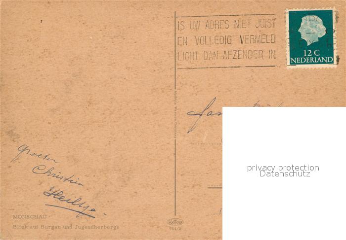 72932302 alte Postkarte Monschau mit Burgau und Jugendherberge postalisch gelaufen Erhaltung siehe scans [WerneD78] KatCode: 11110005354020