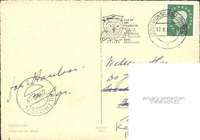 72606718 alte Postkarte Monschau Montjoie NRW postalisch gelaufen Erhaltung siehe scans [NatalD47] KatCode: 11110005354020