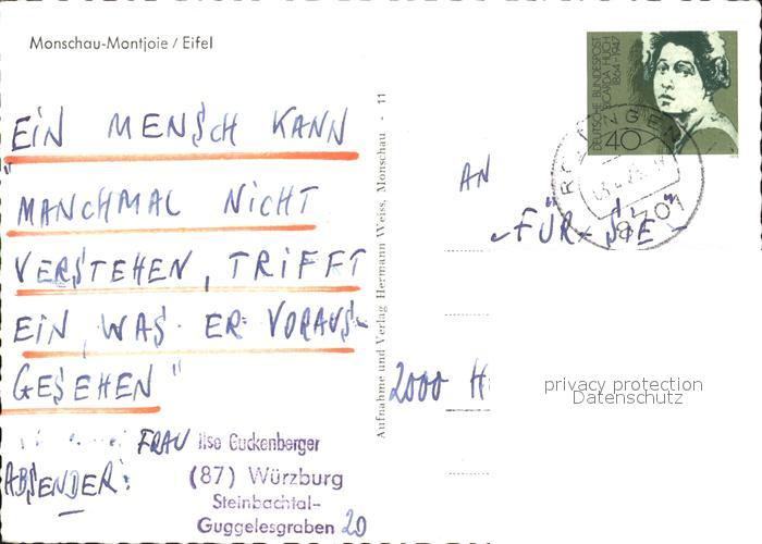 72024410 alte Postkarte Monschau Montjoie NRW postalisch gelaufen Erhaltung siehe scans KatCode: 11110005354020