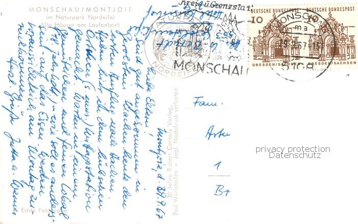 73833190 Monschau Montjoie NRW Alte Haeuser am Laufenbach postalisch gelaufen Erhaltung siehe scans [WerneD78] alte Postkarte Wern Katcode 11110005354020