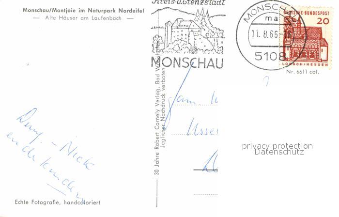 72743205 alte Postkarte Monschau Montjoie NRW Altes Haeuser am Laufenbach Altstadt postalisch gelaufen Erhaltung siehe scans [FriedD77] KatCode: 11110005354020